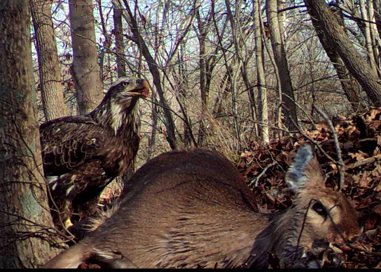 Juvenile bald eagle showing its size and power tearing into the deer.